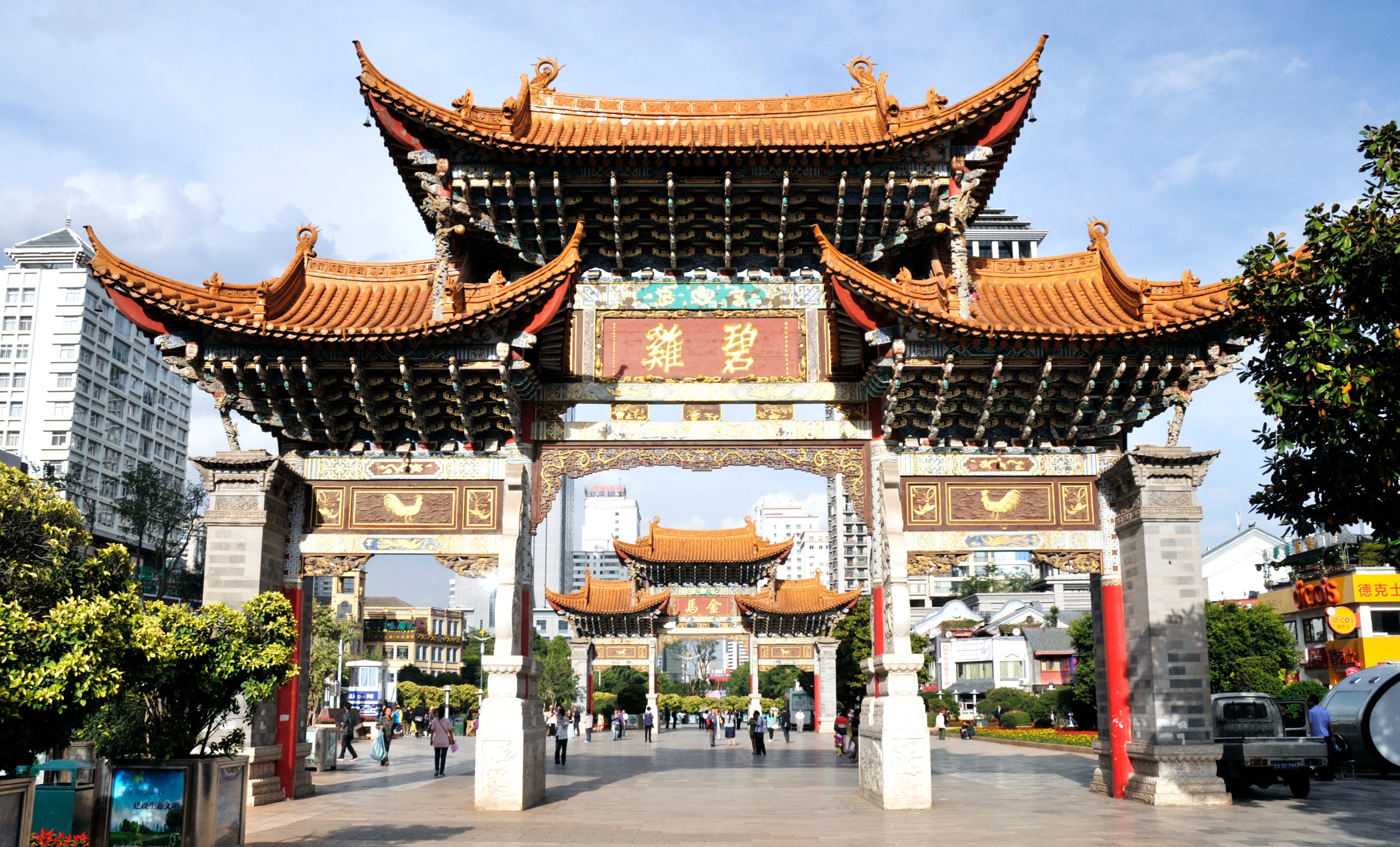 แลนด์มาร์กสำคัญใจกลางเมืองคุนหมิง มีอายุกว่า 400 ปี โดดเด่นด้วยซุ้มประตูจีนโบราณ “ม้าทองคำ” และ “ไก่หยก” สัญลักษณ์แห่งความเป็นสิริมงคลและต้อนรับนักเดินทาง